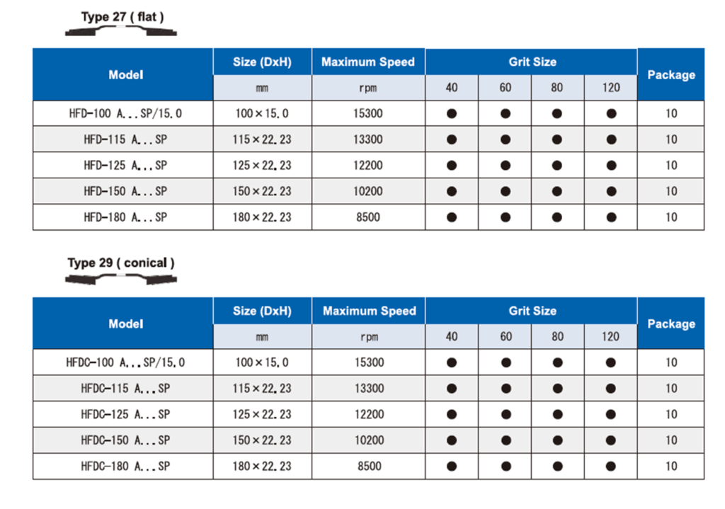 | Order Example | Model number + Grit Size, For e.g. Type 27, dia. 100 mm with grit size #60, the model number will be HFD-100 A 60 SP/15.0 |